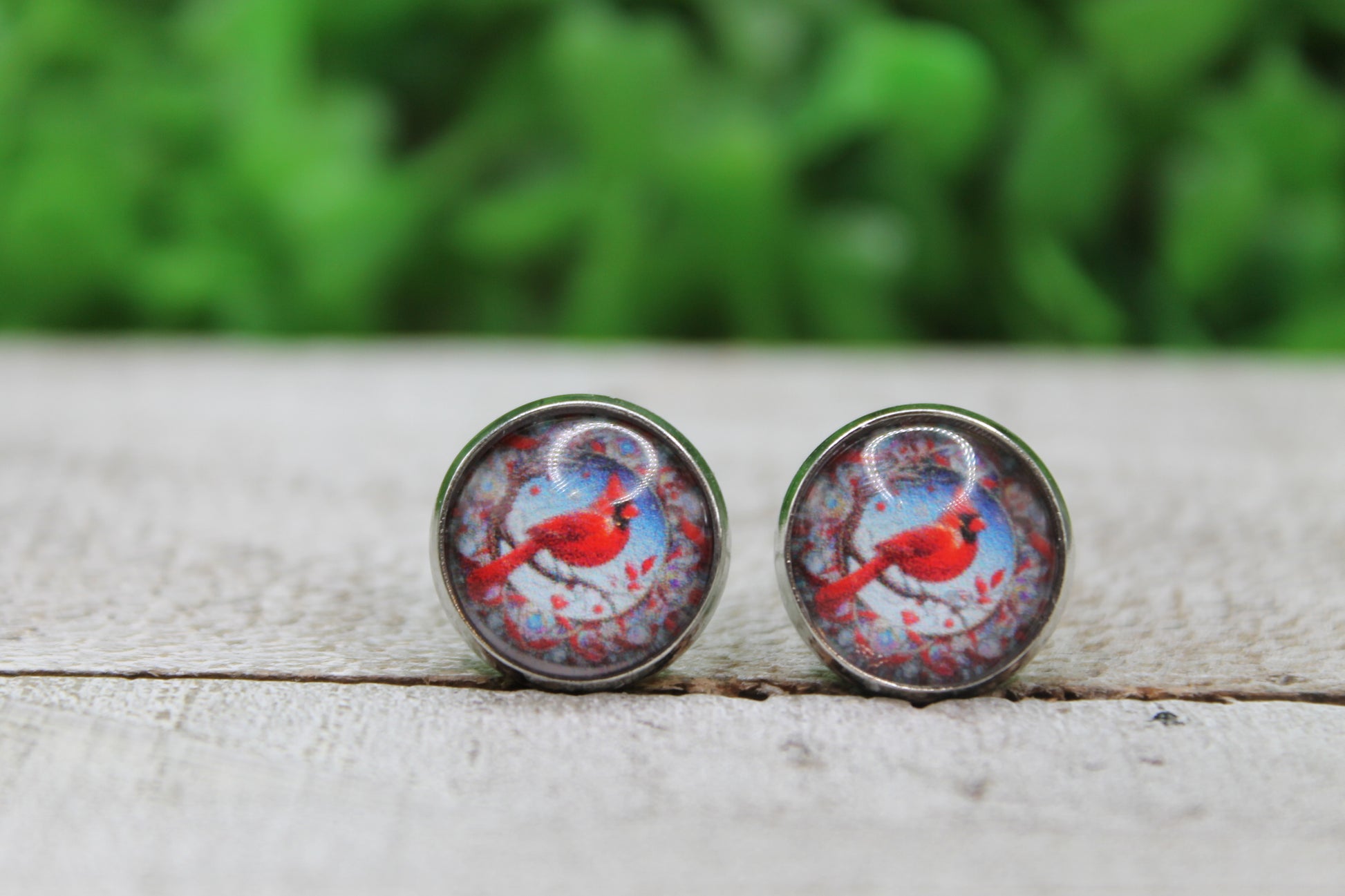 Red Cardinal and Berries Glass Stud Earrings